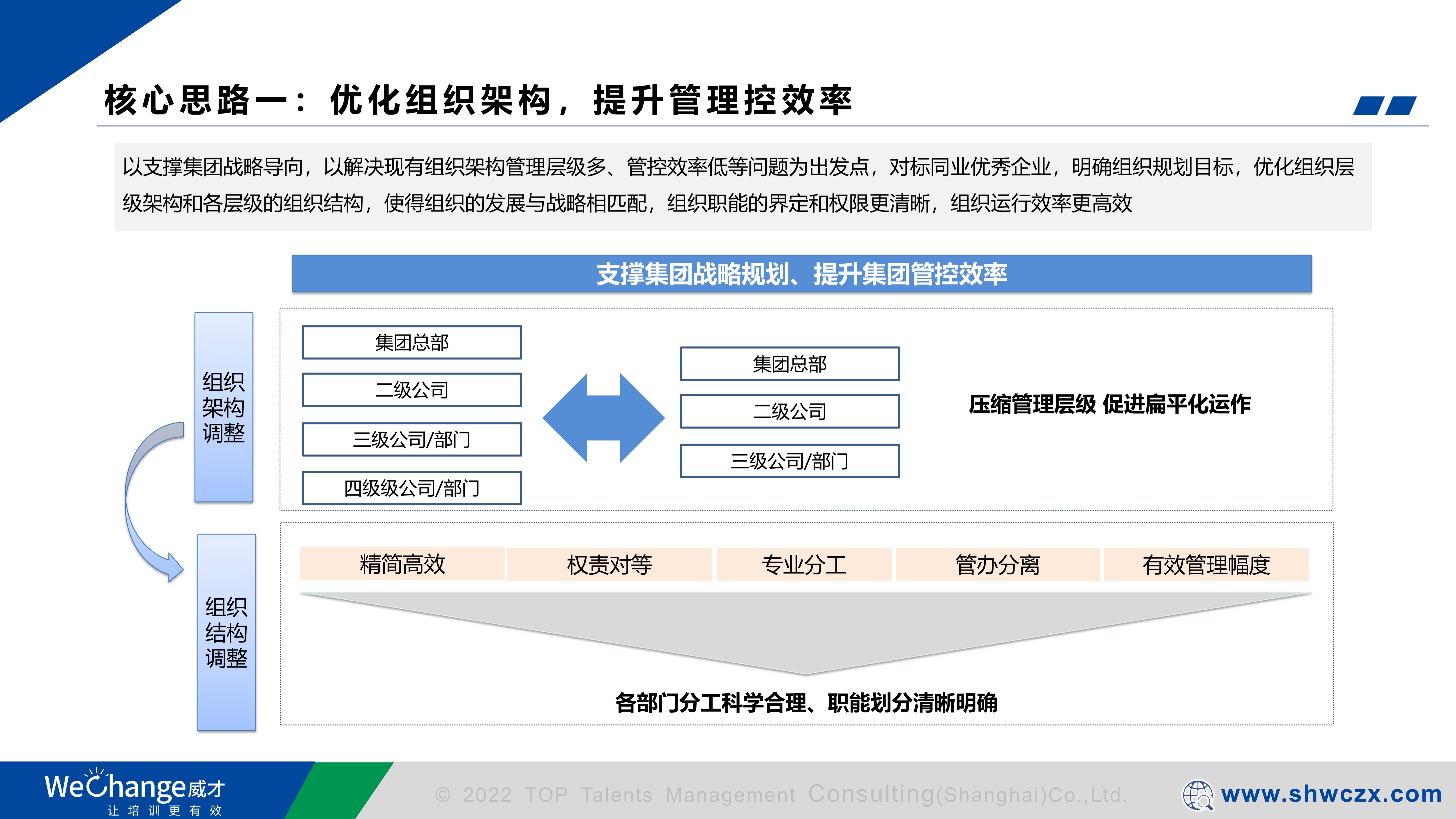 1、以支撐集團(tuán)戰(zhàn)略導(dǎo)向,以解決現(xiàn)有組織架構(gòu)管理層級(jí)多、管控效率低等問(wèn)題為出發(fā)點(diǎn),對(duì)標(biāo)同業(yè)優(yōu)秀企業(yè),明確組織規(guī)劃目標(biāo),優(yōu)化組織層級(jí)架構(gòu)和各層級(jí)的組織結(jié)構(gòu),使得組織的發(fā)展與戰(zhàn)略相匹配,組織職能的界定和權(quán)限更清晰,組織運(yùn)行效率更高效;