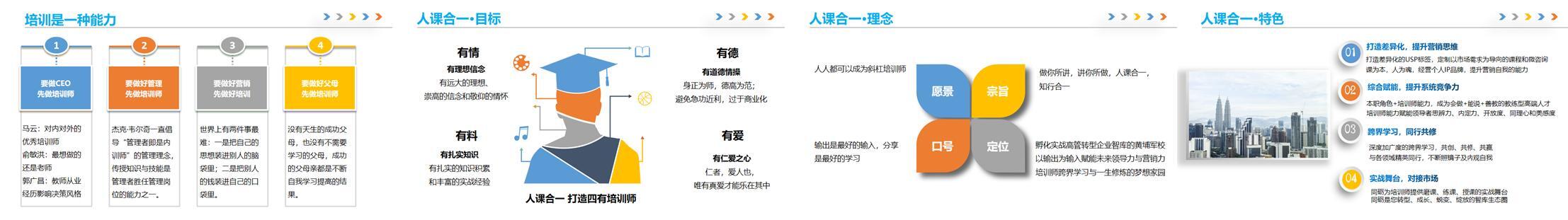 第四天白天 | 《營銷篇-培訓師營銷思維》 ① 大客戶營銷的三個階段 ② 培訓師高情商說的技巧 ③ 培訓師高情商問的技巧 ④ 培訓師高情商關系經營的技巧 ⑤ 培訓師的核心專業能力 如何做三方調研 如何做現場調研 如何做案例采集 如何開電話會議 如何做現場拜訪 如何出定制化大綱 如何批改作業 如何做總結報告 等等 《轉型篇-培訓師轉型通過之旅》 u 培訓師學習篇 u 培訓師成長篇 u 培訓師發展篇 u 培訓師終身成長的18關進階之旅 結訓儀式: 回顧總結、頒發證書、宣誓儀式等 | 1) 培訓師營銷思維及情商訓練實戰模擬 2) 超級培訓師的情商訓練 3) 行動學習:我的轉型發展計劃 |