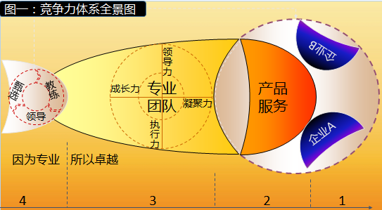 現代社會商場如戰場。如【圖一:企業競爭力體系全景】所示,兩個企業A與B之間的競爭,表面上是產品與服務的競爭,實際上是專業團隊之間的競爭,即領導力與執行力. 成長力與凝聚力之間的競爭,本質上是領導干部的競爭. 人才甄選與員工教練能力的競爭。